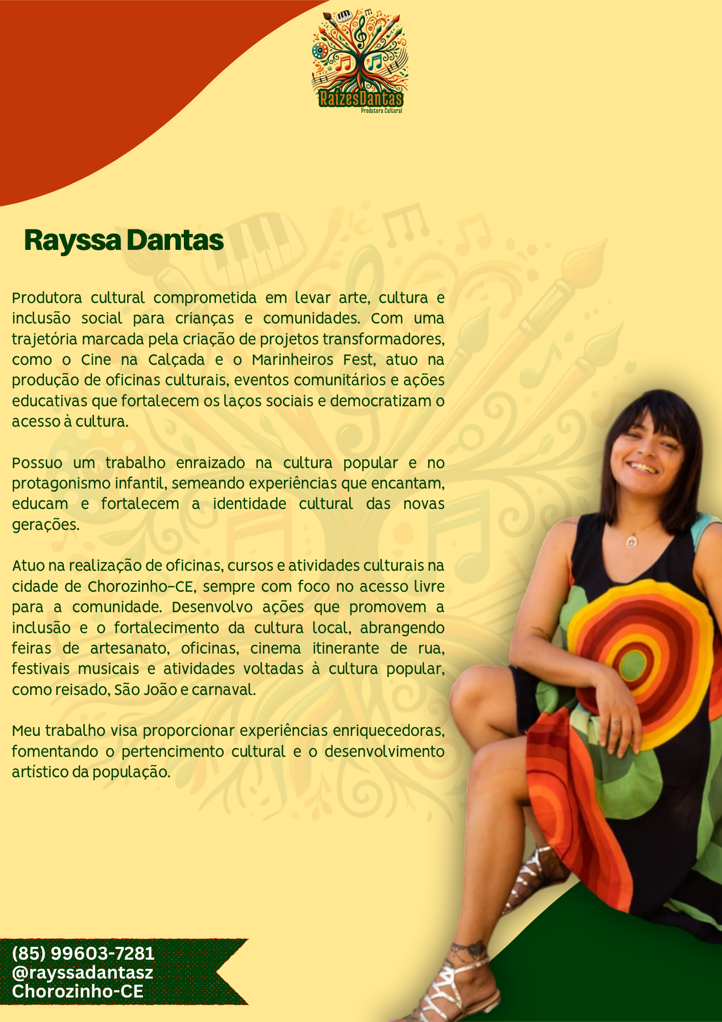 Com compromisso e paixão, uso a arte para transformar vidas e inspirar comunidades. Estou aqui para criar algo incrível com você e fazer a diferença na vida das pessoas.