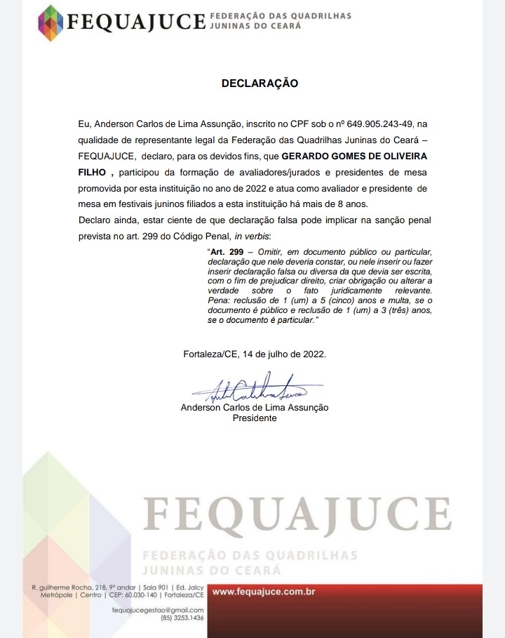 - Jurado e Presidente de Mesa da entidade FEQUAJUCE – Federação de Quadrilhas Juninas do Estado do Ceará;
