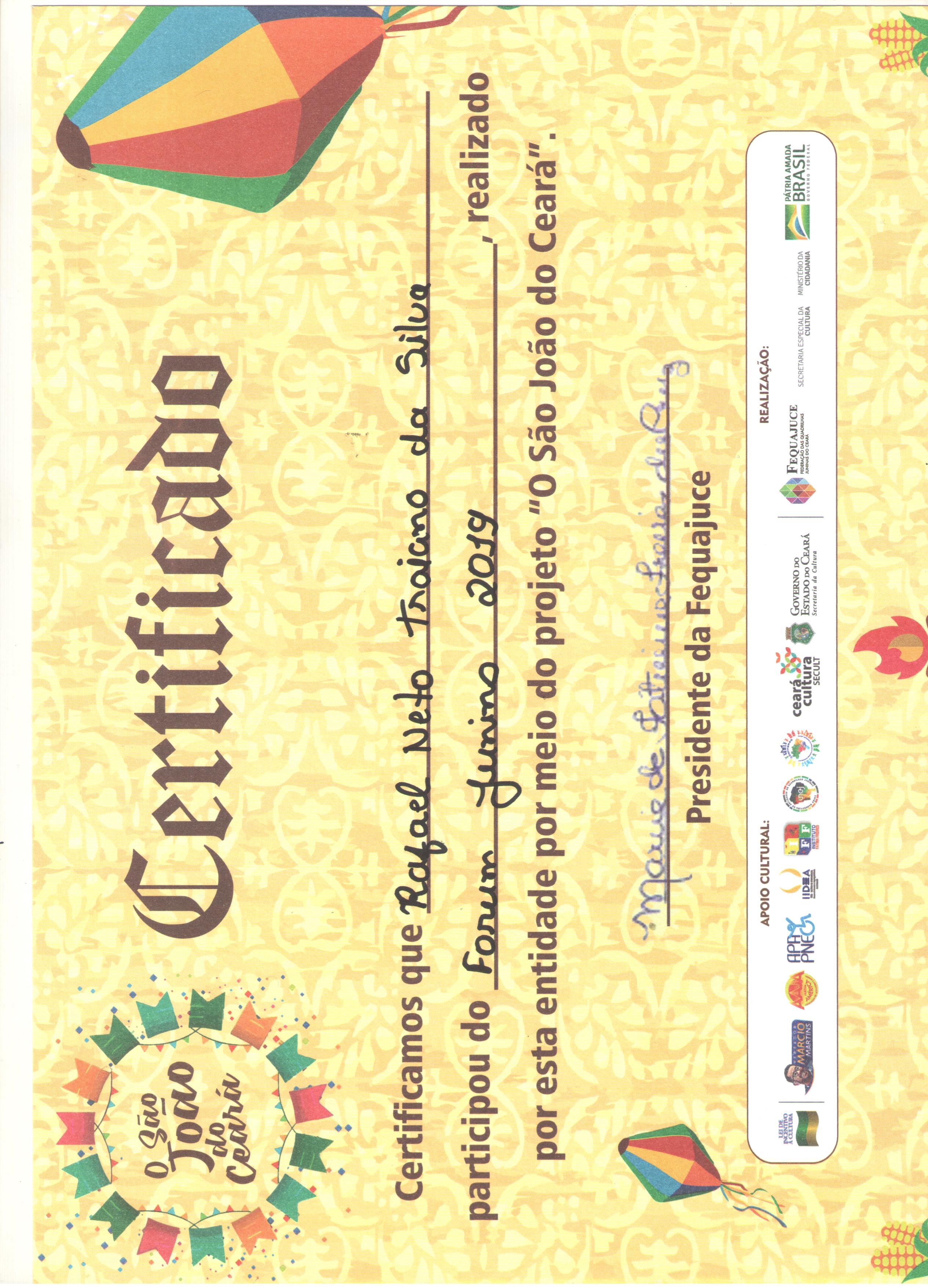 • Produtor da Primeira Lapinha Viva Junina Renascer, projeto o qual participou do evento Noite Feliz na Praça da Matriz organizado pela Prefeitura Municipal de Tabuleiro do Norte em Dezembro de 2019;