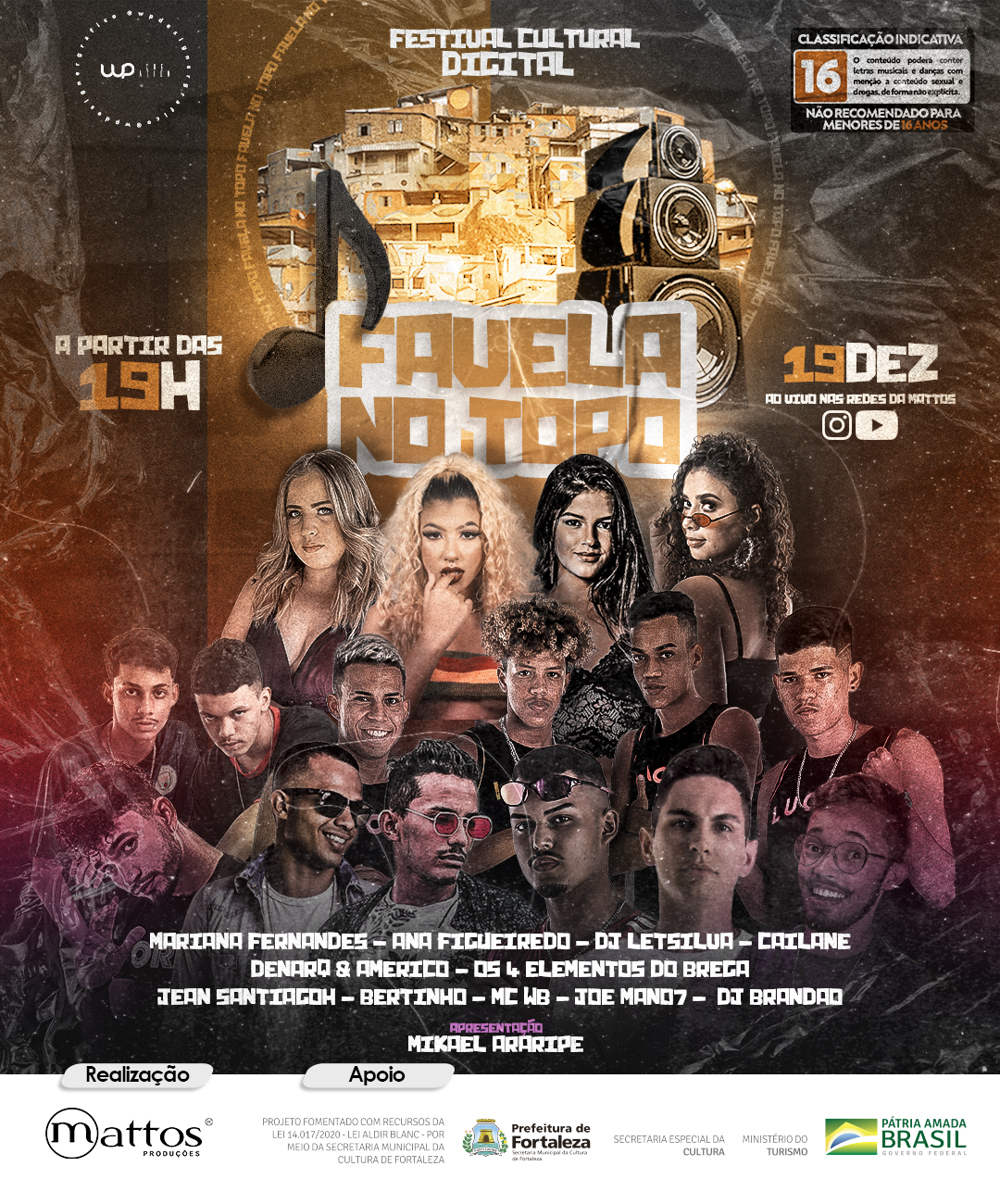 O Festival Cultural Digital Favela No Topo é um evento online que acontecerá em parceria com a Prefeitura de Fortaleza, através de transmissão ao vivo no canal do youtube e perfil do Instagram da Mattos Produções. O festival tem o objetivo de promover a imagem de comunidades carentes como geradoras de talentos culturais e não apenas violência, como é propagado pela maioria das mídias.PROJETO FOMENTADO COM RECURSOS DA LEI 14.017/2020 - LEI ALDIR BLANC - POR MEIO DA SECRETARIA MUNICIPAL DA CULTURA DE FORTALEZA.